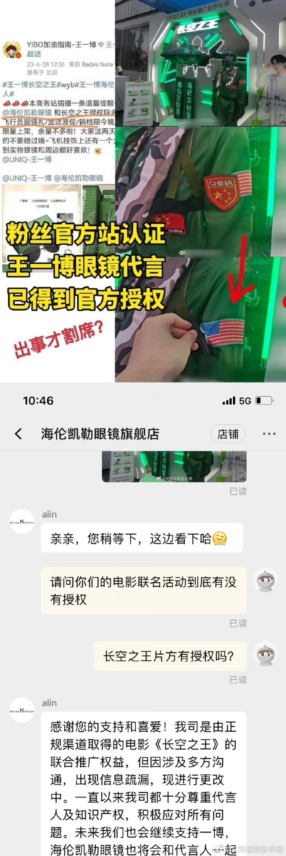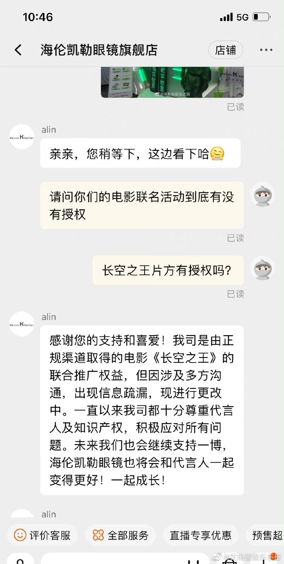 3、眼镜品牌方的客服说自己拿到授权