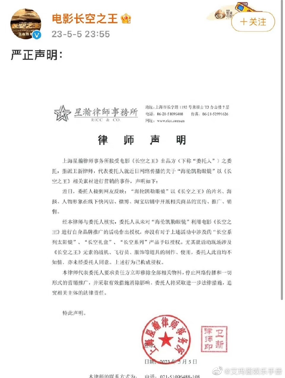 2、王一博主演的《长空之王》发声明说对方侵权