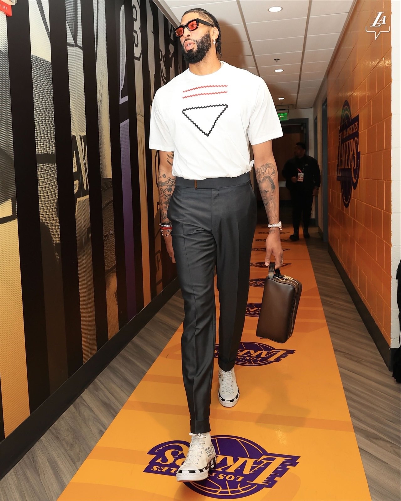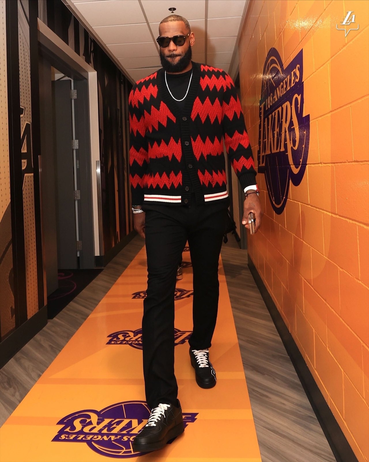 > 两米大长腿~詹姆斯黑红条纹毛衣入场 浓眉红色眼镜配奢华小包