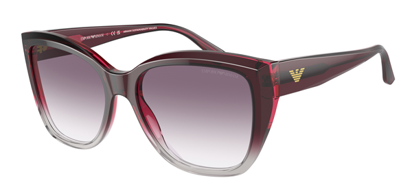 这是一款猫眼形眼镜,由醋酸纤维材料制成,生物基碳含量不少于 54%,其前框为几何形设计,镜腿上饰有鹰形徽标。同色系渐变镜片的制作材料中包含部分尼龙纤维,其生物基碳含量为 41%。 配色有棕色-绿色渐变镜架配绿色渐变镜片,灰色-紫色渐变色镜架配紫色渐变色镜片。