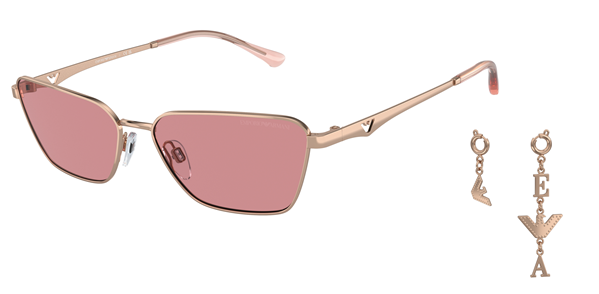 这是一款极为独特的女式太阳眼镜,拥有纤细的金属镜架以及略显方正的蝴蝶形镜圈。镜腿上以两条不同长度的链条悬起 Emporio Armani 经典鹰标, 这一奇特细节绽放出无穷的魅力。提供两种亮面配色:玫瑰金镜架配粉色镜片,银色镜架配浅蓝色镜片。