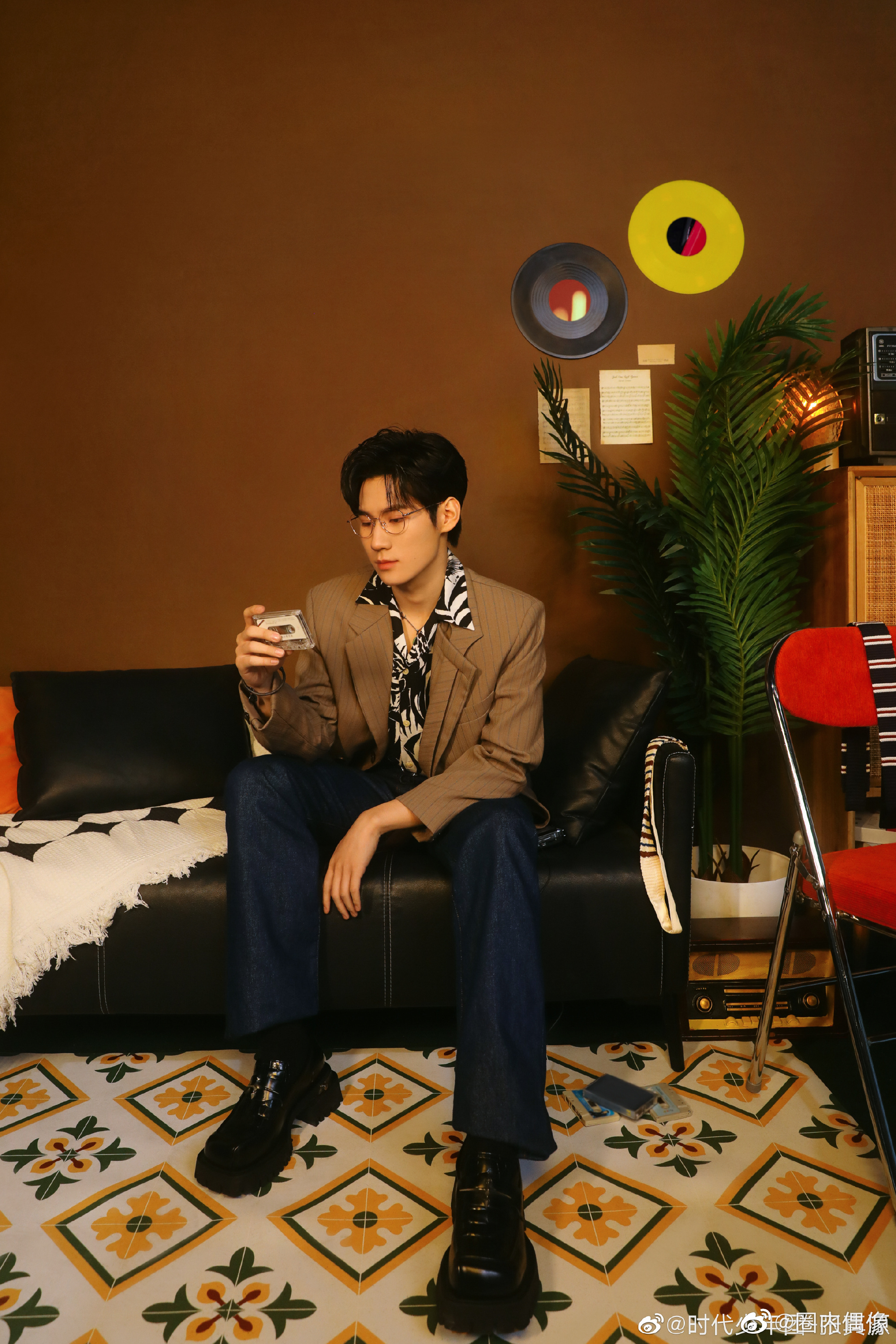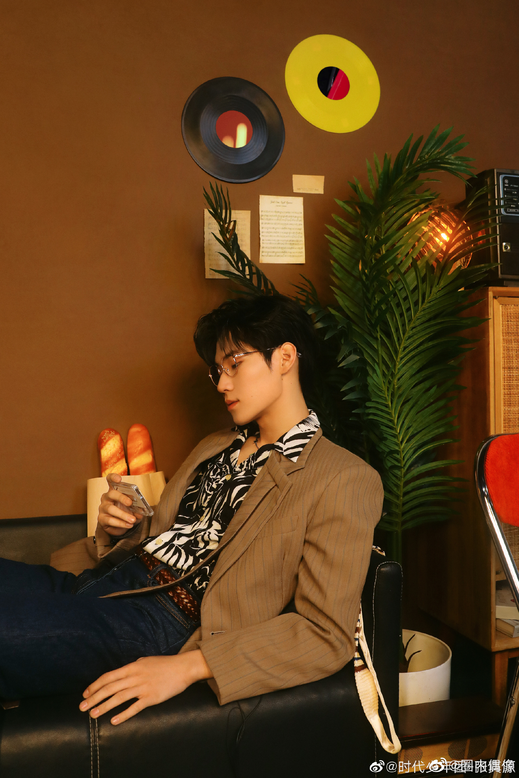 张真源棕色条纹西服随拍,西服搭配银框眼镜矜贵十足,手扶眼镜太帅了!