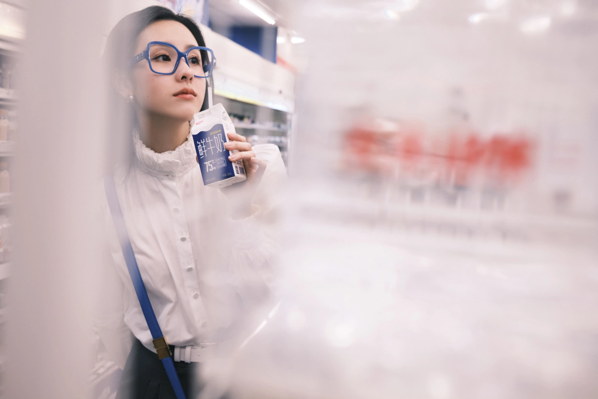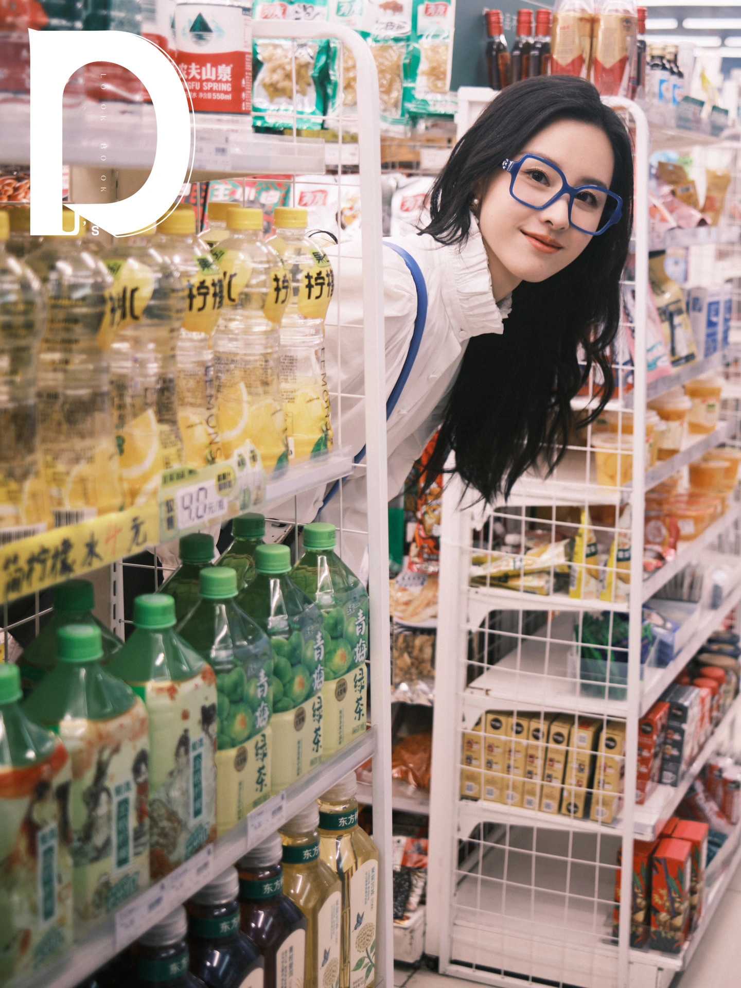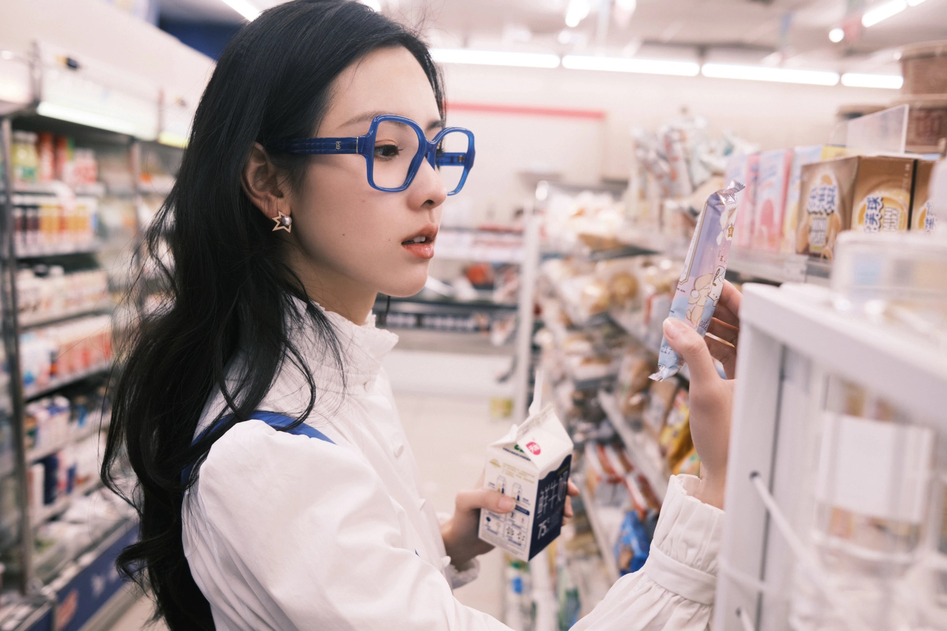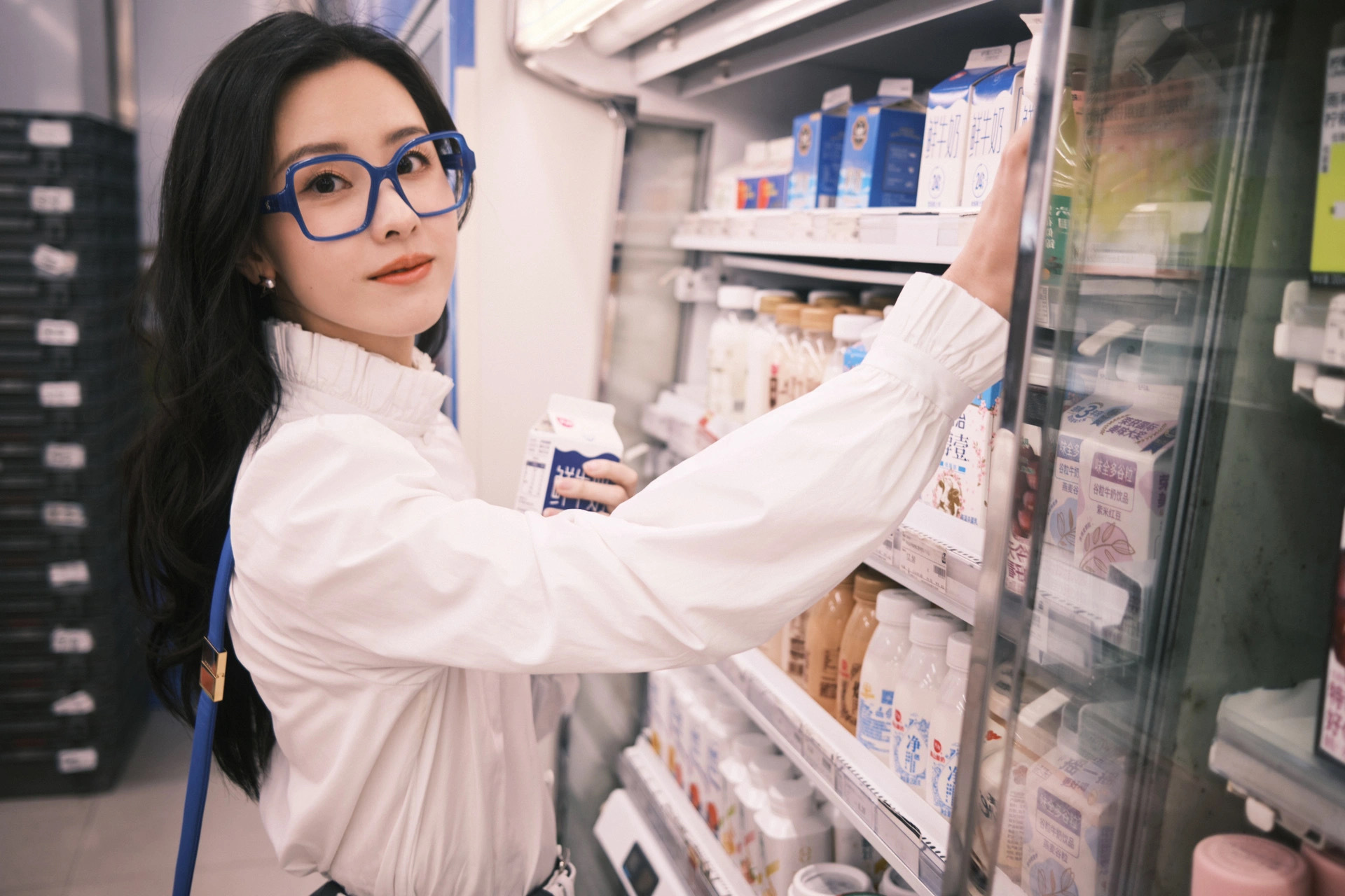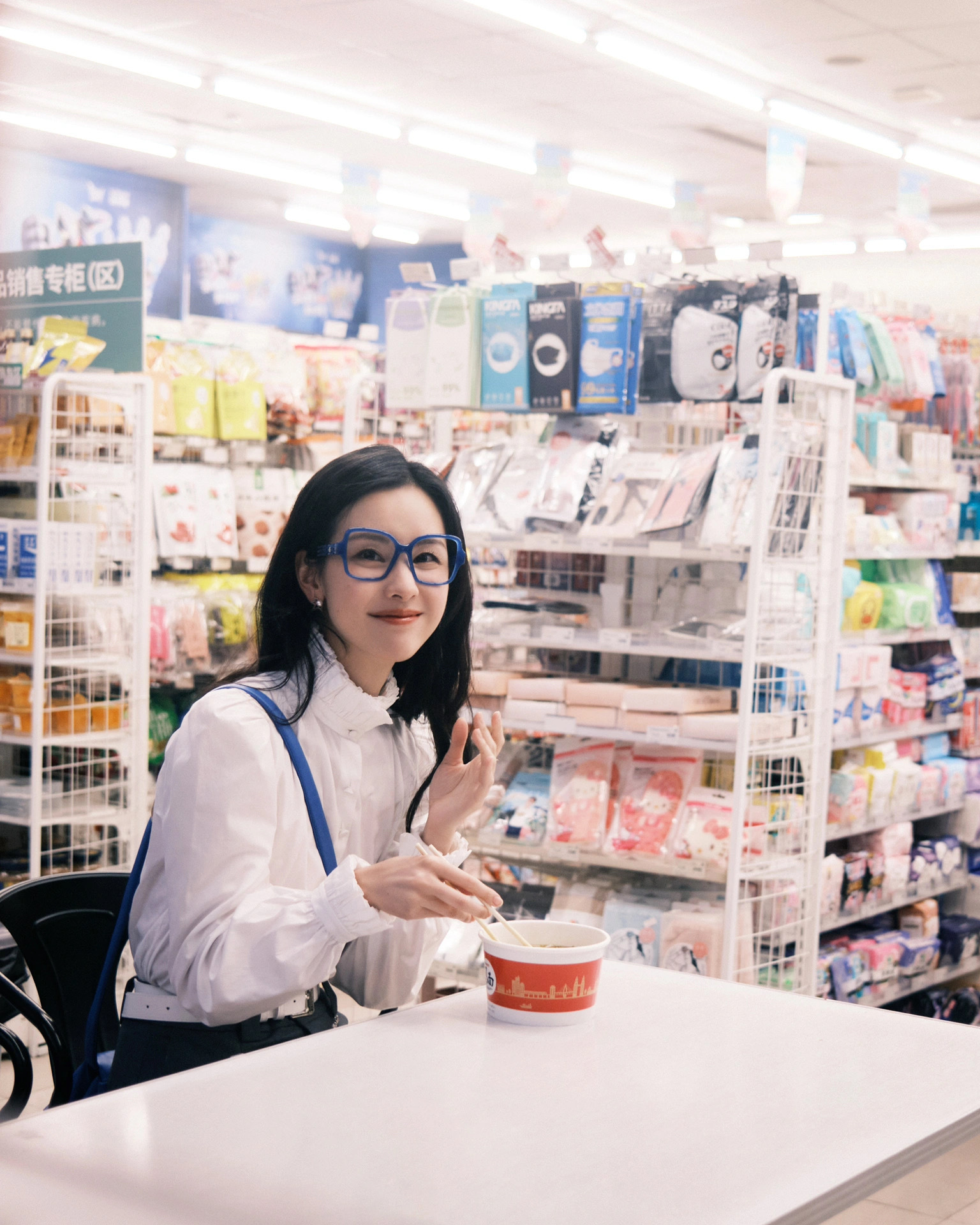 白衬衫+蓝框眼镜造型,今天是逛便利店的陈嘟嘟