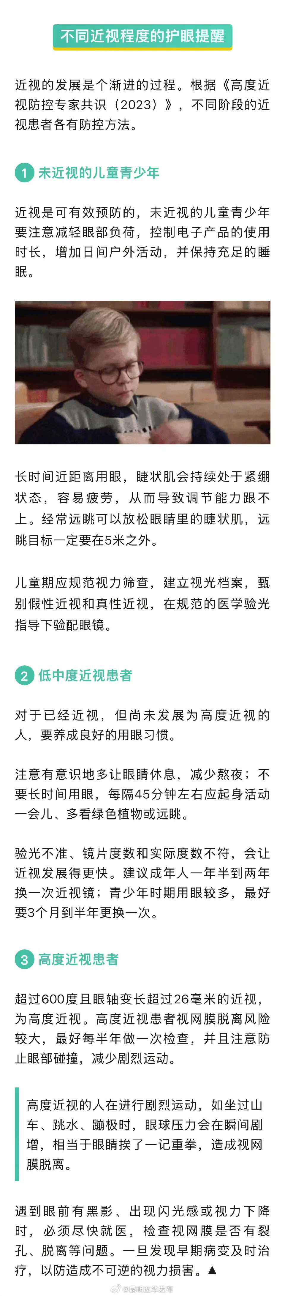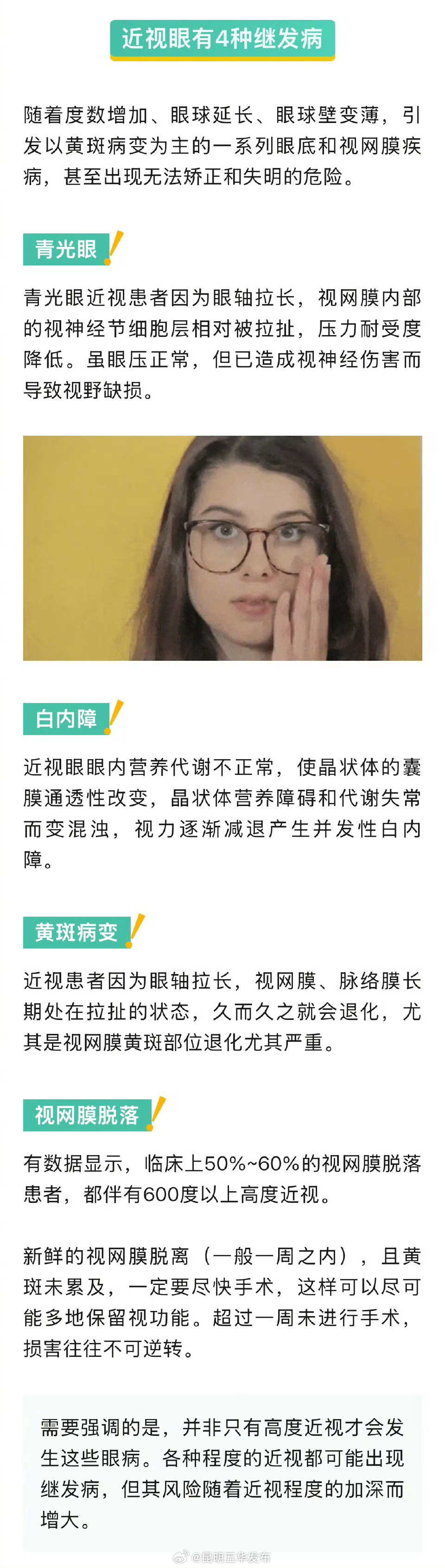 高度近视一年最好查一次眼底一般认为,超过600度(儿童为400度)的近视即为高度近视。高度近视人群,近视度数每增加100度,眼轴长度大概增加0.37毫米。眼轴越长,眼部肌肉及眼底的视网膜所受到的牵拉就越大,更可能引起斜弱视、后巩膜葡萄肿、玻璃体变性或液化、眼底出血、视网膜裂孔和脱离、青光眼及白内障等疾病。在配眼镜时,高度近视患者不必追求最好的矫正视力,以能提高视力而不引起眼疲劳为佳。(生命时报)