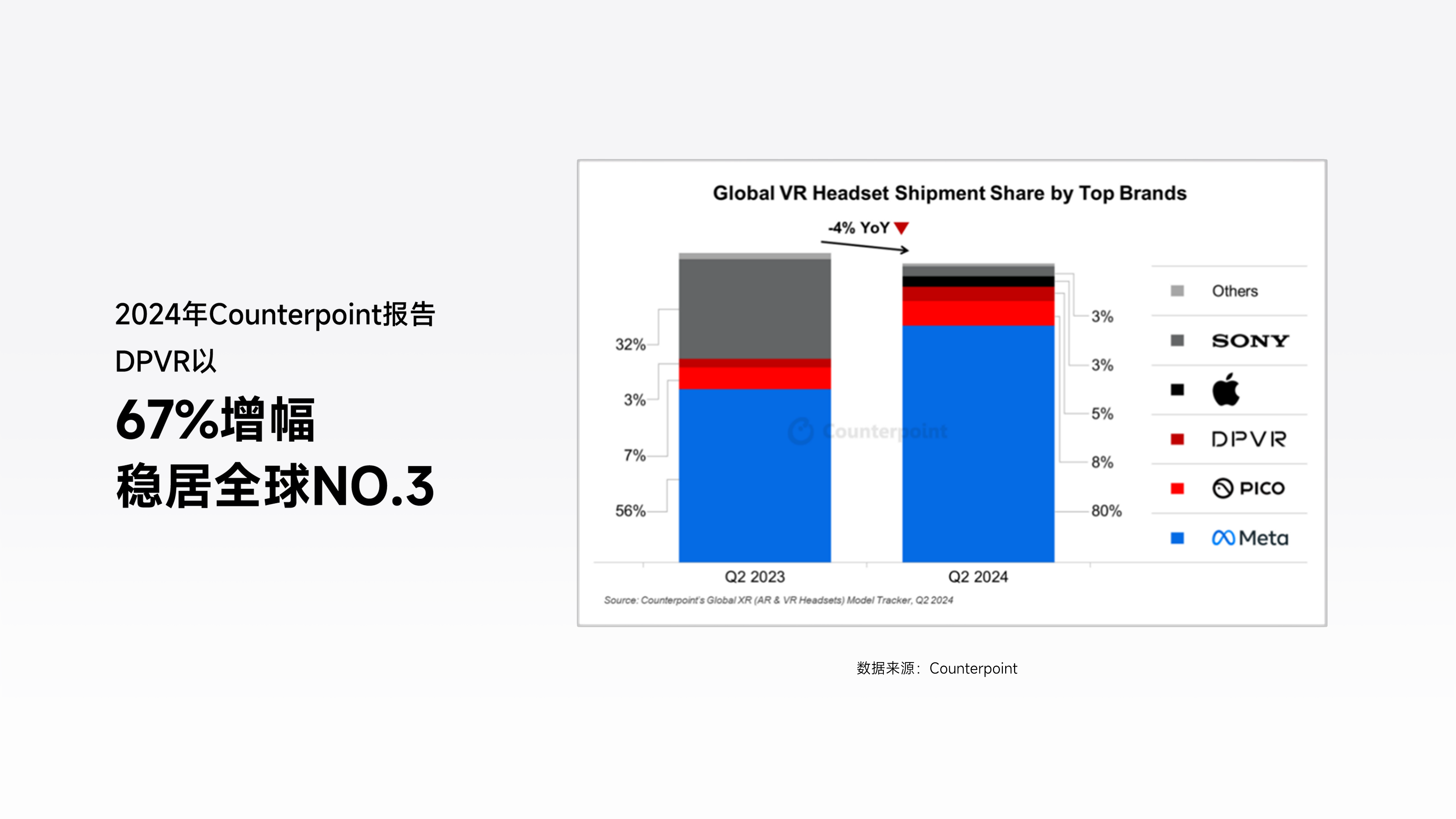 作为国内最早布局VR硬件的企业之一,DPVR在行业内已深耕十年。数据显示,其PCVR设备占据国内线下游艺店VR设备80%的市场份额,全球头显出货量在2024年同比增长67%,跻身全球前五。