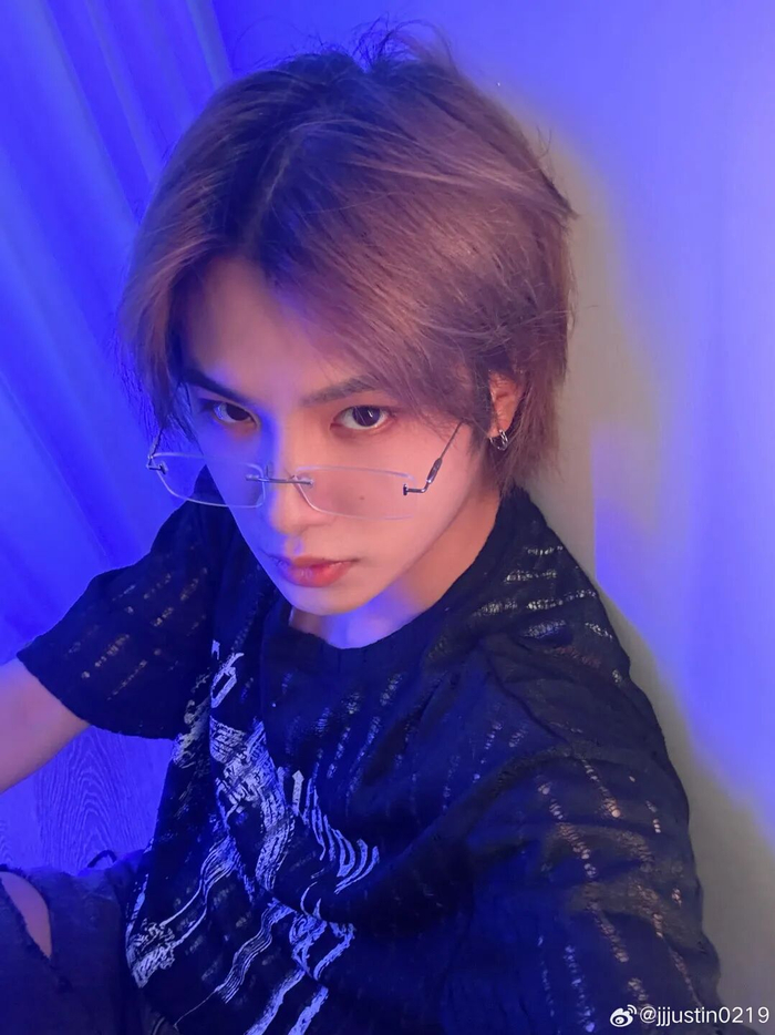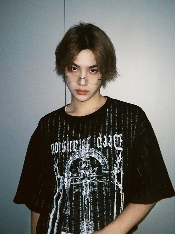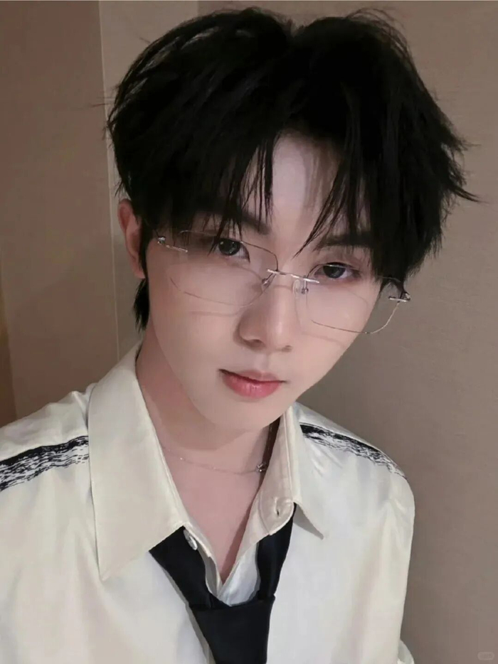 黄明昊打破正装与眼镜的固定搭配,用圆领 T 恤代替,再搭配无框眼镜,演绎出独特的街头随性感。
