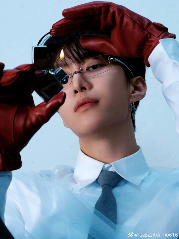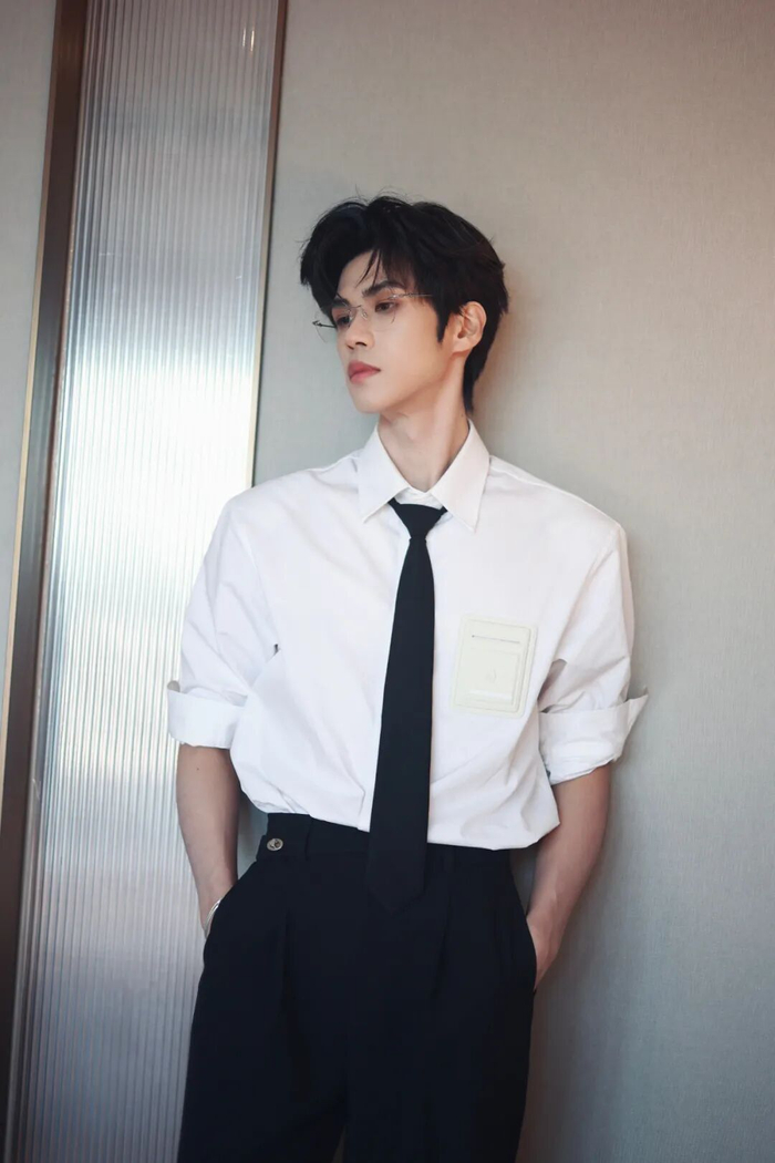 范丞丞近期的造型,可谓是将禁欲系风格演绎得淋漓尽致。以这套造型为例,身穿不对称薄纱衬衫,搭配领带与无框眼镜,冷静中透着强势气场。一抹红色系手套的加入,更为这份理智至上的氛围,渲染出一丝危险而迷人的张力。