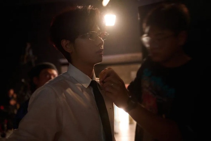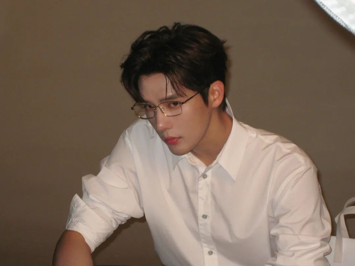 胡先煦用无框眼镜塑造出不同的成熟韵味。极简的镜框线条,在灯光下微微反射出光泽,与他沉稳的姿态相得益彰,悄然完成了从少年感转向轻熟风。