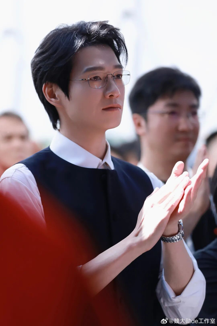 魏大勋在搭配上注重层次感的叠加。以复古风格的马甲叠穿衬衫,再搭配无框眼镜,为整体造型注入了高智感内核,也让人联想到他饰演孟宴臣时期的经典形象。
