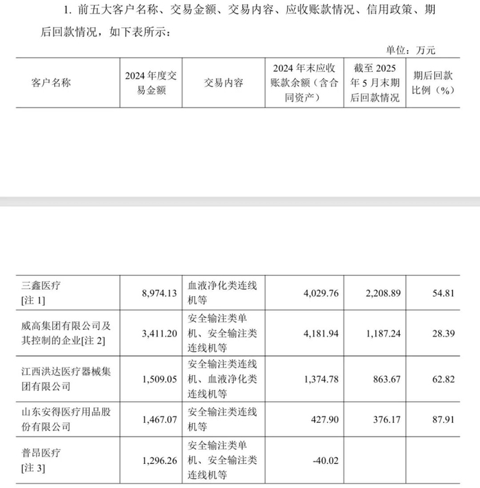 从客户情况来看,迈得医疗的营收高度依赖前五大客户,包括三鑫医疗、威高集团、洪达医疗等。2024年,前五大客户销售额1.66亿元,占全年营收的比例高达60.61%,其中,第一大客户三鑫医疗占比32.65%。这意味着,若客户变动将对公司业绩造成很大影响。