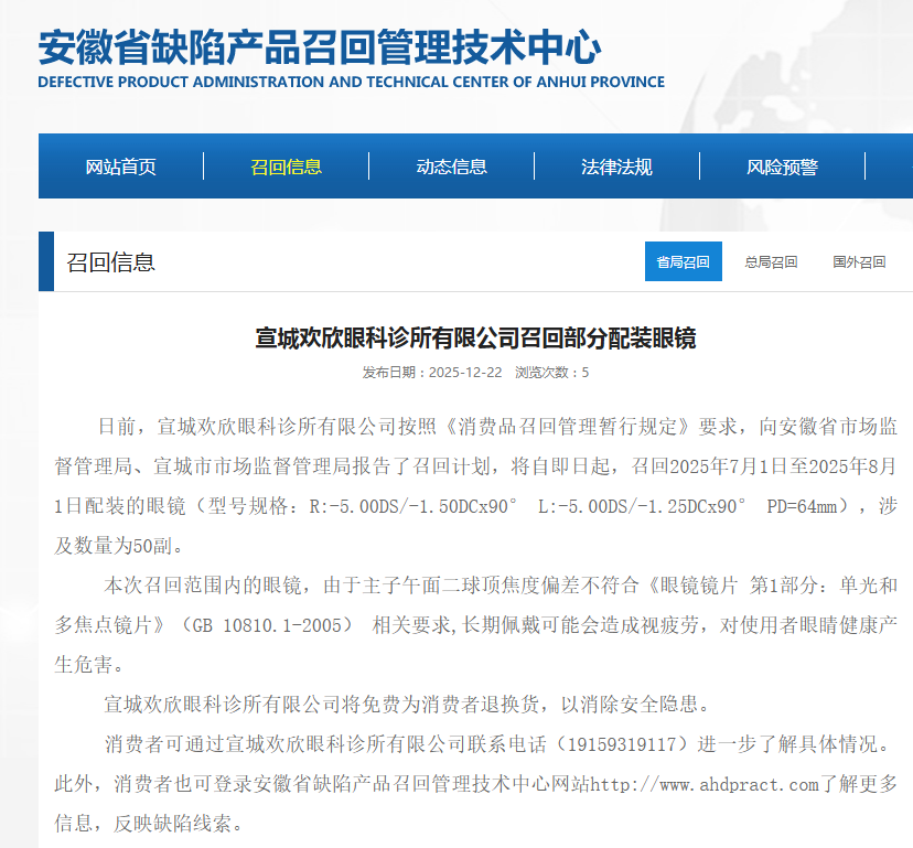 中国质量新闻网讯 据安徽省缺陷产品召回管理技术中心网站消息,日前,宣城欢欣眼科诊所有限公司按照《消费品召回管理暂行规定》要求,向安徽省市场监督管理局、宣城市市场监督管理局报告了召回计划,将自即日起,召回2025年7月1日至2025年8月1日配装的眼镜(型号规格:R:-5.00DS/-1.50DCx90° L:-5.00DS/-1.25DCx90° PD=64mm),涉及数量为50副。